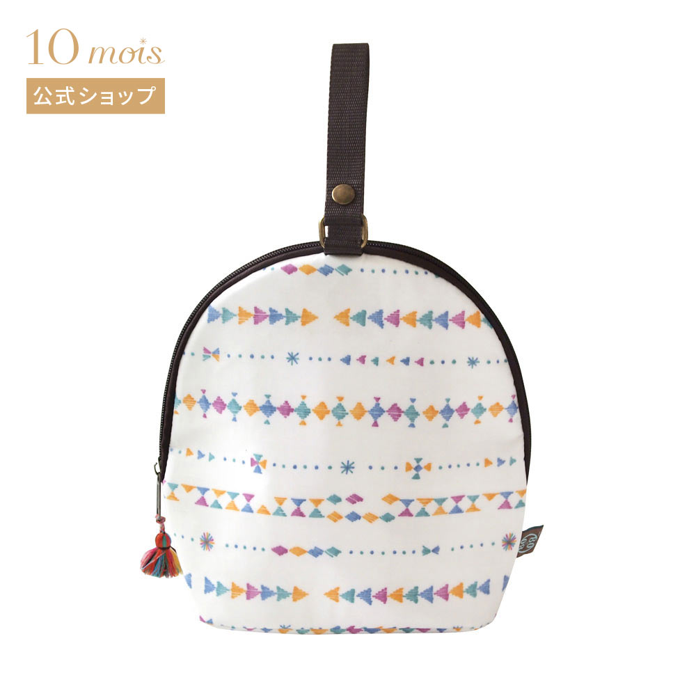 白基調の爽やかな色合いで、マルチカラーのタッセルがかわいいワンポイントになっている哺乳瓶ポーチ。表面はコーティングが施されていて汚れにくく、汚れてもサッと拭き取るだけできれいになります。持ち手も取り外せて便利です。